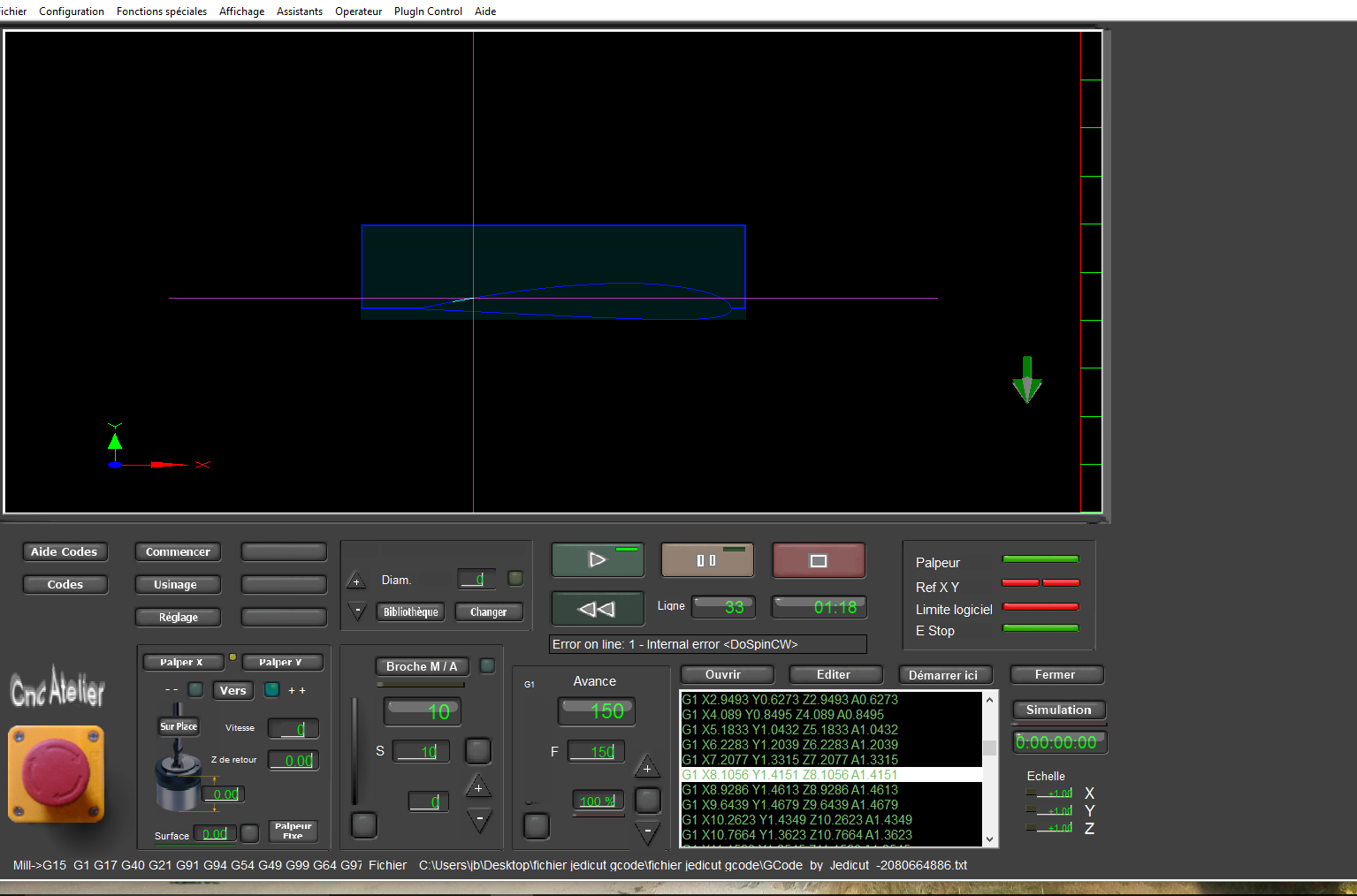 Bonjour , j'ai utilisé les profils de Jedicut sortie en Gcode sur MACH3 . Voila le résultat en photos, avec WIN 10 .
