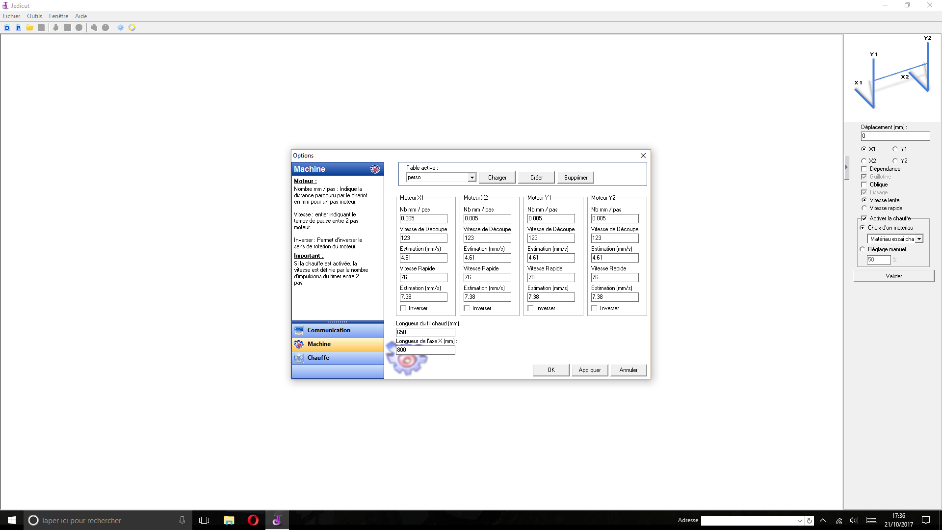 Bonjours, et bien oui cela fonctionne. La liaison avec la carte est OK. Sur les deux pc windows 10 et 7 J'ai tout, la vitesse et la chauffe. Par contre je confirme ce que tu disait pour la mise en route, il faut brancher le 12v moteur en dernier, du moins sur Windows 7 . Je viens de faire une simulation de découpe et ça marche. Je suis heureux je vais enfin utiliser Jedicut . Un grand merci à Alain pour le plugins qui permet l'évolution et la continuité de Jedicut.
