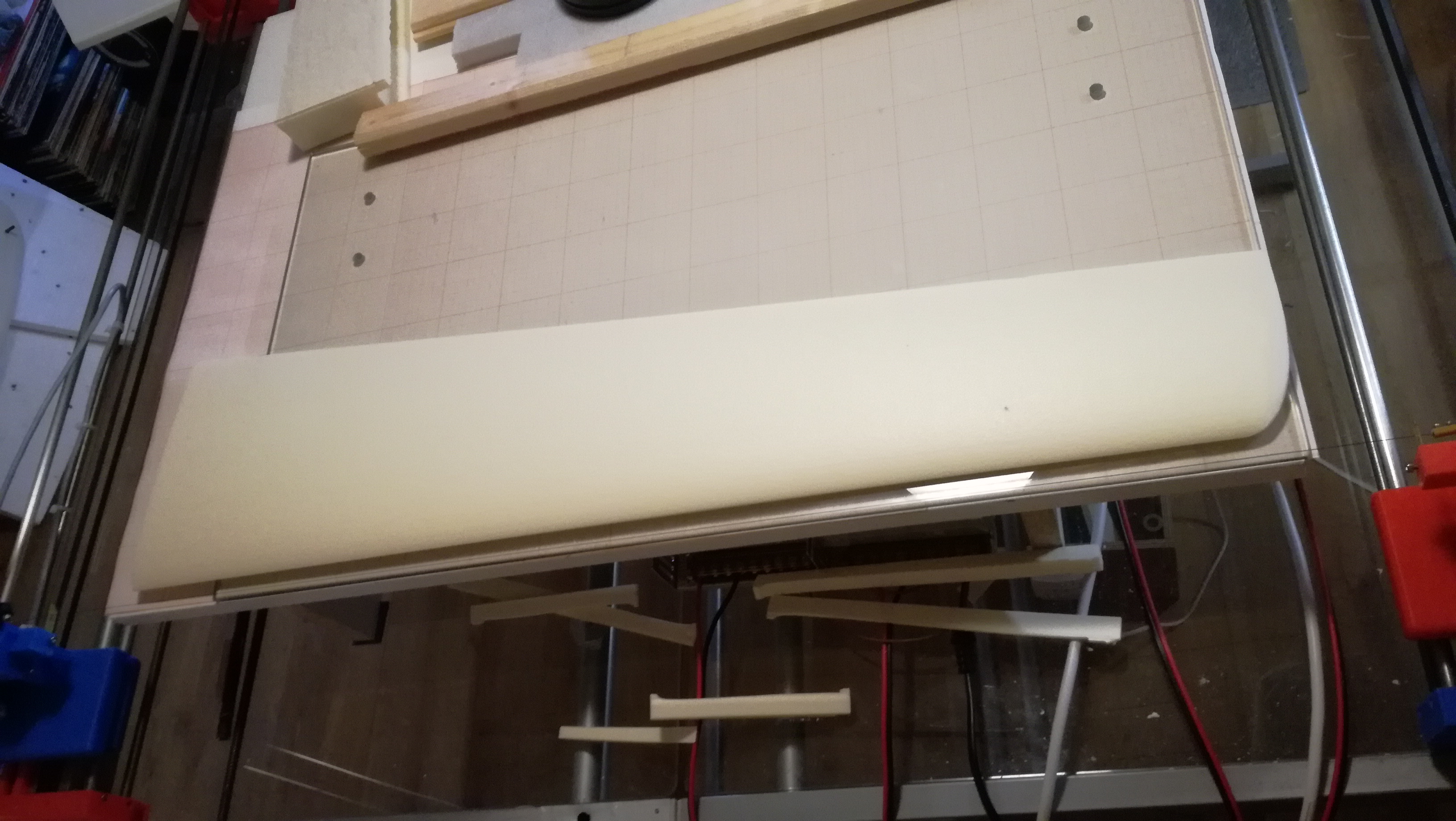 Pour la découpe, il faut être au garage ou maison, au plus près de toi et en bas, tu positionnes le bloc juste derrière le fil, la découpe commencera par le bord d'attaque, de l'extrados, puis bord de fuite, retour vers le bord d'attaque avec le dégagement et découpe de l'intrados puis retour par dégagement.